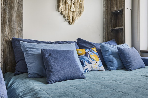 Интерьер апартаментов с почасовой оплатой выполнен в светлых тонах с добавлением голубых и коричневых красок в элементах декора, штор, покрывала. Для комфортного проживания предусмотрены: