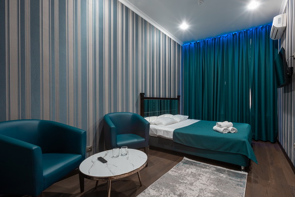Номер Комфорт — это уютное пространство, созданное специально для двоих. В центре внимания — большая двуспальная кровать с ортопедическим матрасом, которая дарит настоящий комфорт и возможность забыть обо всём. Мягкий свет, тишина и полная приватность помогают настроиться на нужный лад. В номере есть всё для уединения: современная душевая кабина, журнальный столик, кондиционер.