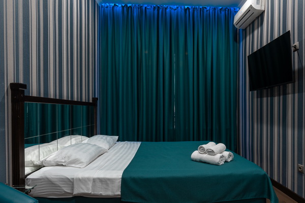 Широкая кровать с ортопедическим матрасом, кондиционер, свой душ и свежее бельё — всё продумано, чтобы вы забыли о времени.