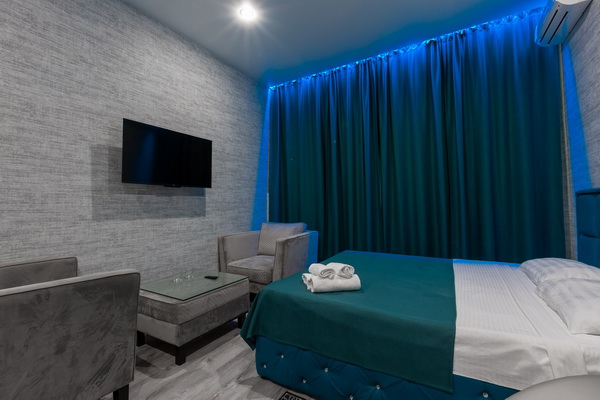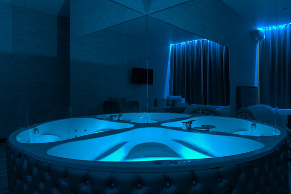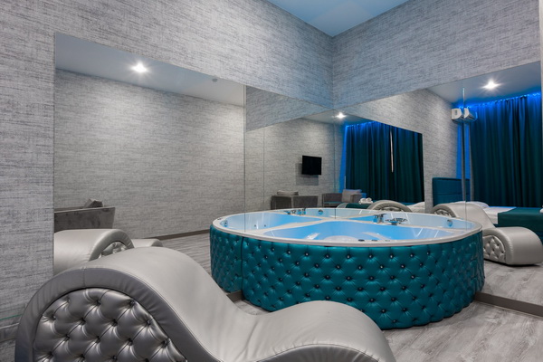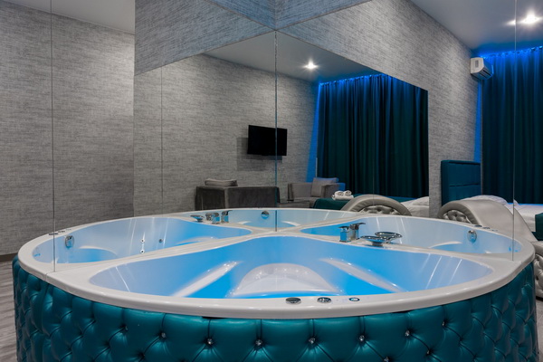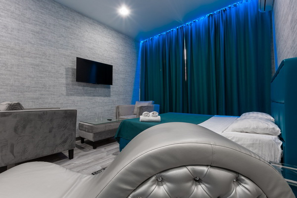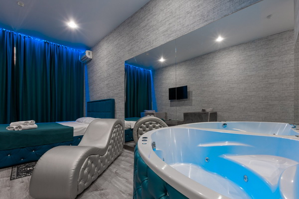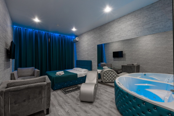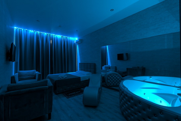 Этот номер с джакузи создан для того, чтобы забыть о суете. В центре внимания — просторная джакузи с синей подсветкой. Мягкий свет, тёплая вода и лёгкий массаж снимают напряжение дня, настраивая на спокойный лад. А когда хочется особого настроения — включается подсветка, и комната наполняется тихим сиянием.