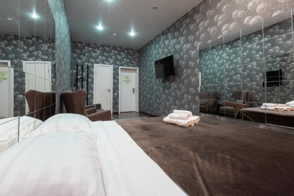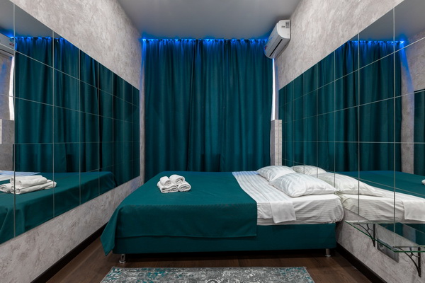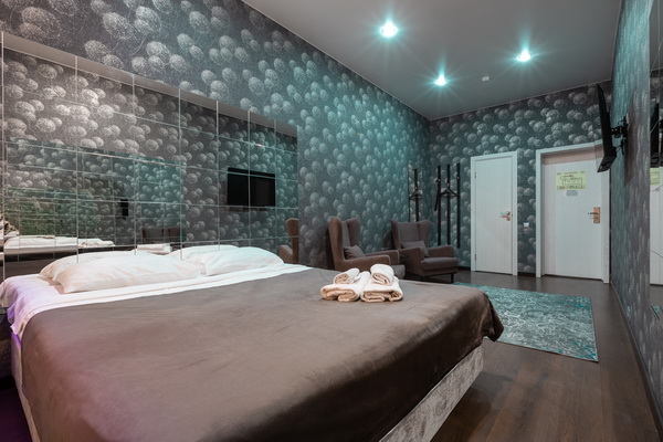 Номер Делюкс с зеркальным интерьером — это пространство, где границы исчезают. Зеркала на стенах и потолке множат каждое движение, каждый взгляд. Вы включаете приглушённый свет — и комната наполняется глубиной, мерцанием, тайной.