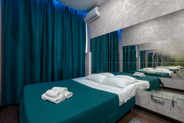 Интерьер продуман для двоих: большая кровать с ортопедическим матрасом, зеркала, кондиционер и удобный санузел. Всё чистое, свежее, без лишних деталей.