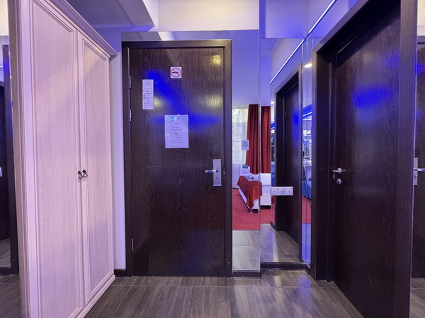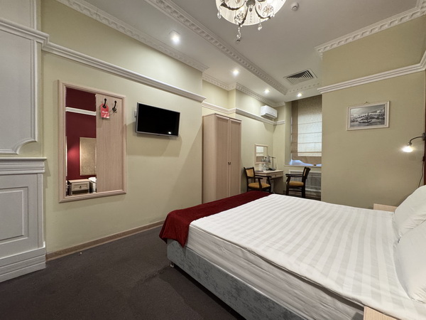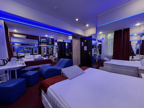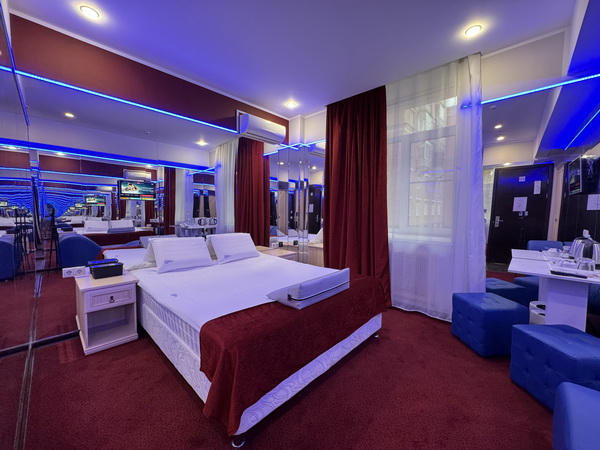 Вы сможете самостоятельно отрегулировать желаемое освещение номера, благодаря множеству источников света и ламп с цветофильтрами. Эффект полной иллюминации или интимный полумрак с цветными световыми акцентами: выбирайте, что по нраву, и наслаждайтесь необыкновенным рандеву на двоих! Также, по договоренности с администрацией, можно заблаговременно набрать джакузи (девайс «Улучшенного Делюкса»), украсив ванную лепестками роз и свечами. Здесь всегда рады вашим креативным предложениям и готовы пойти навстречу в их реализации.