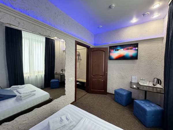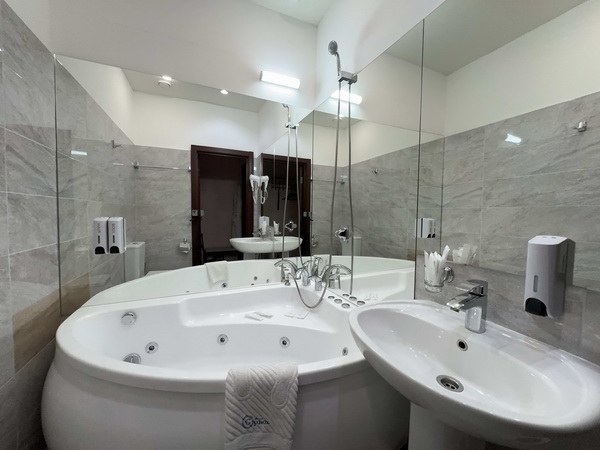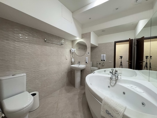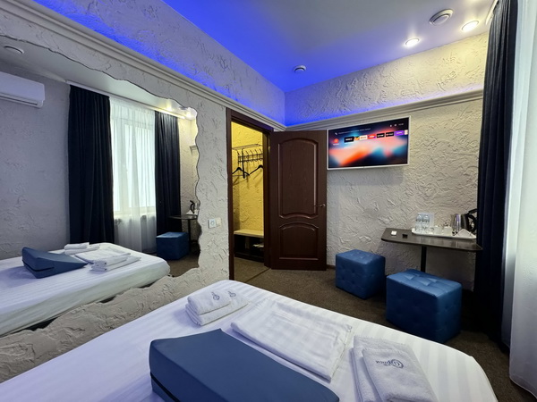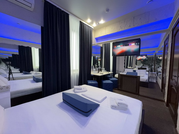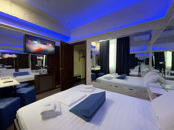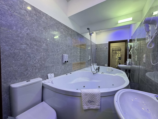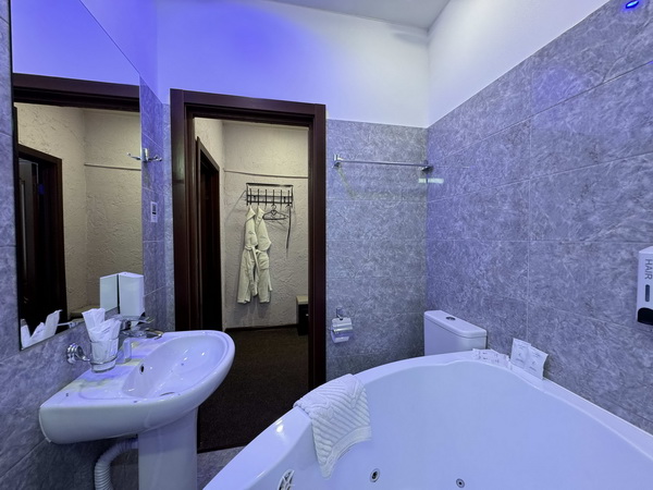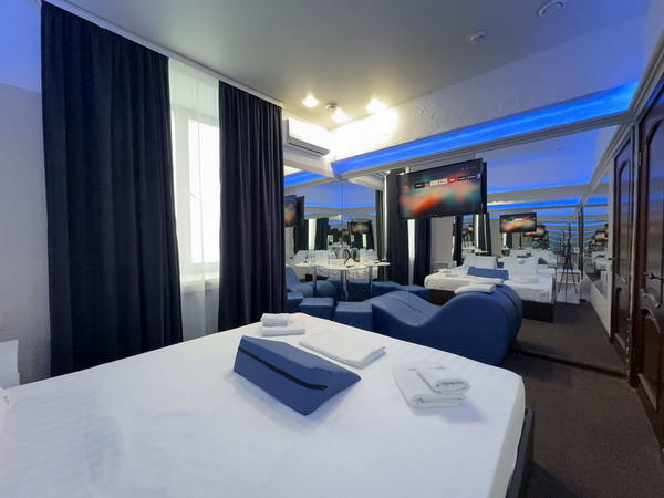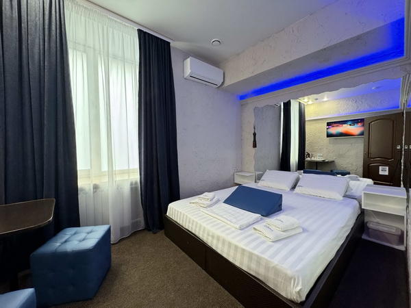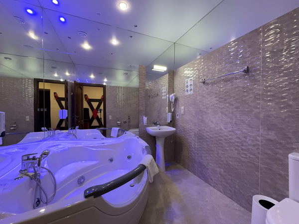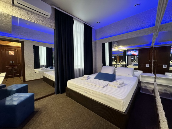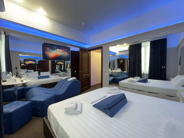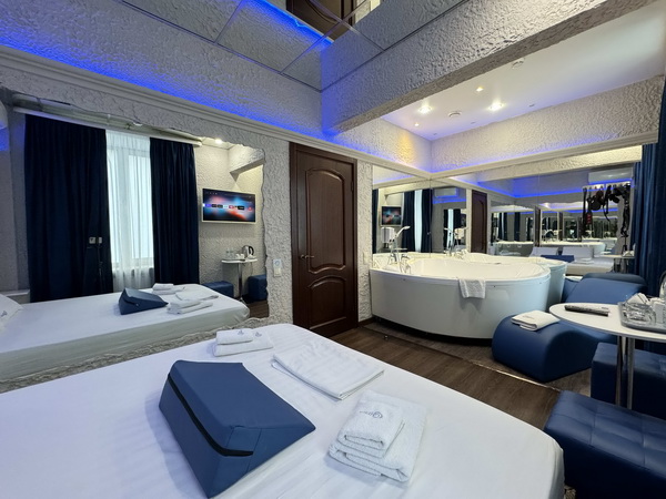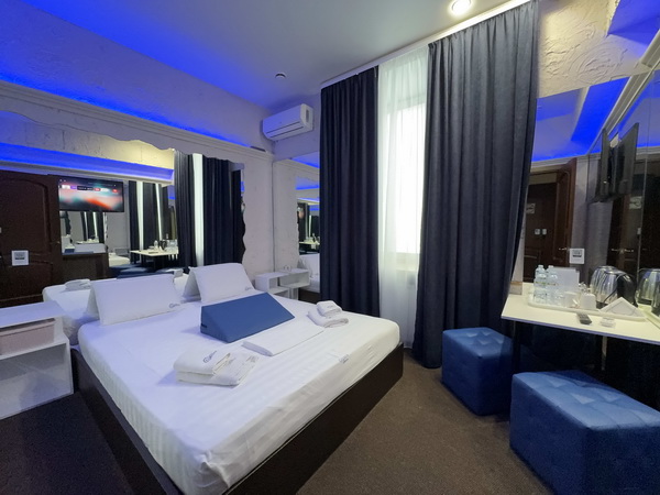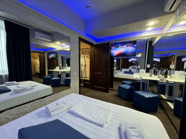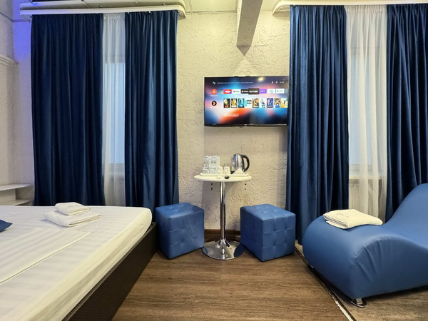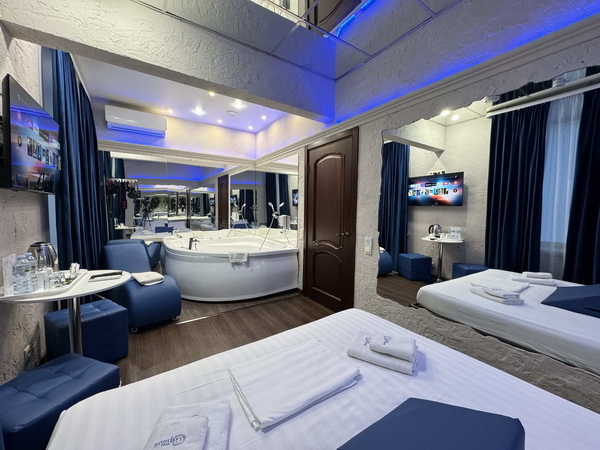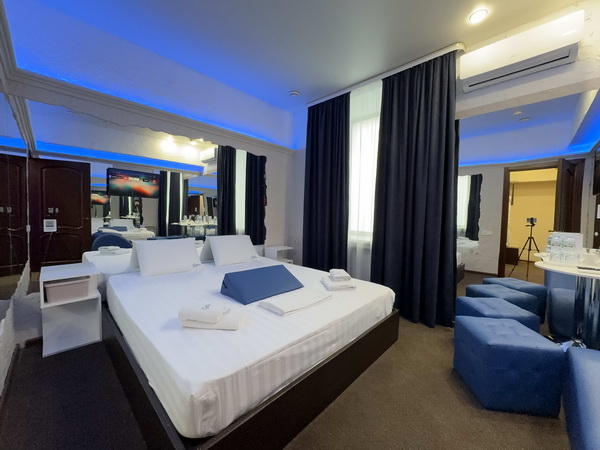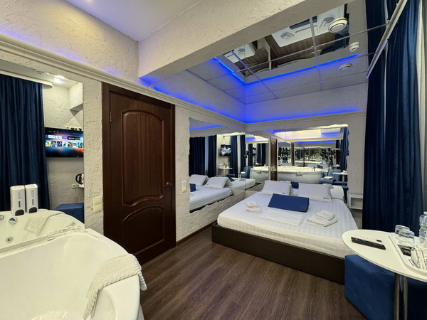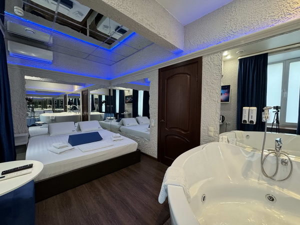 В номере есть: двуспальная кровать с тумбочками, стол со стульями, RGB подсветка, кондиционер, телевизор с Android TV, онлайн-кинотеатры с премиум подписками, колонка Алиса + Умный дом, чайная станция, бутилированная вода, полотенца, гигиенические принадлежности, халаты, тапочки, фен, джакузи для двоих в спальной зоне.