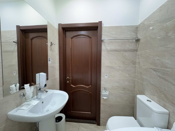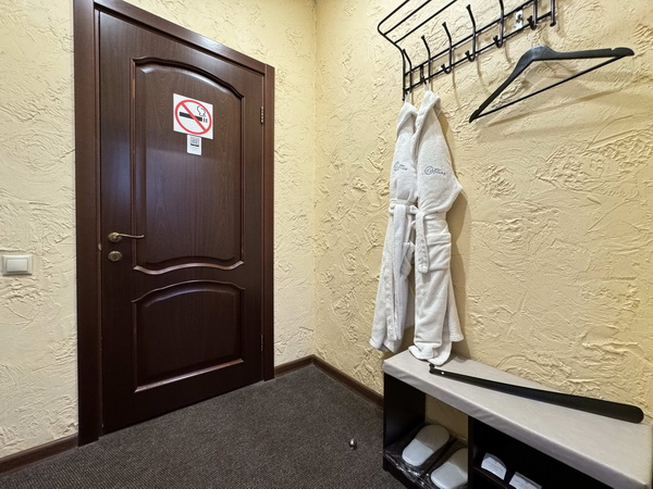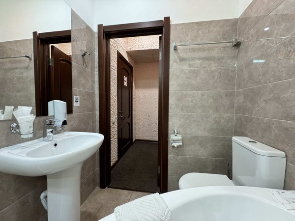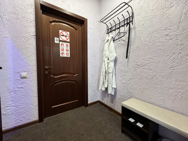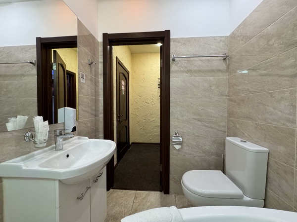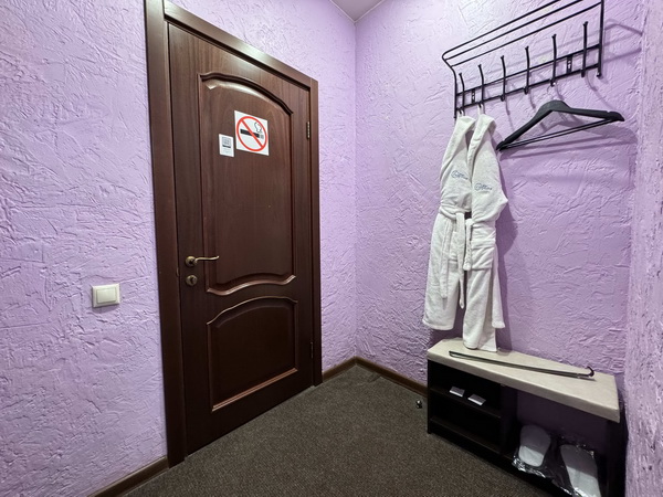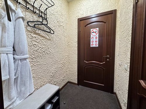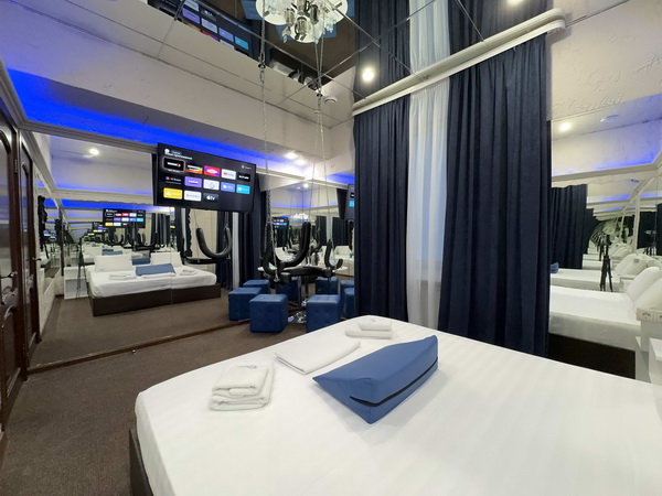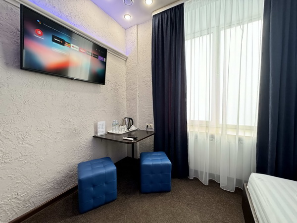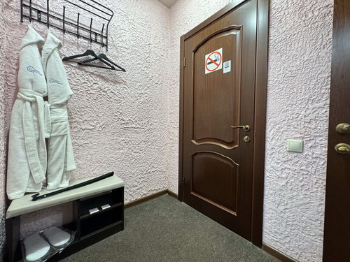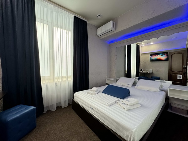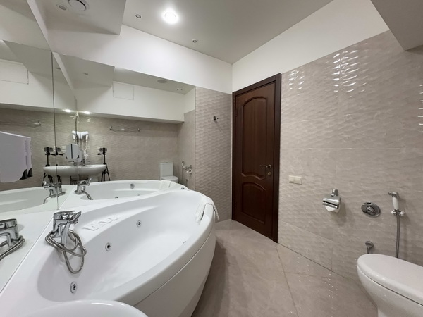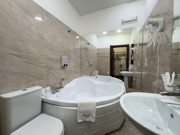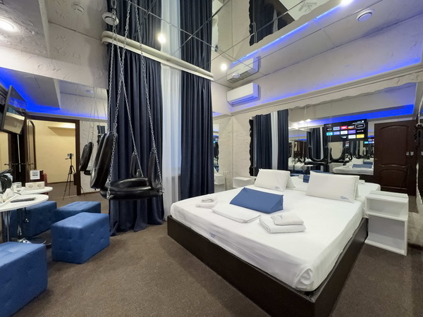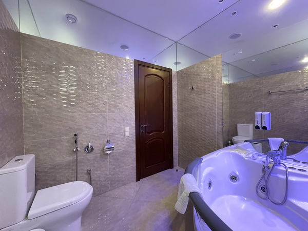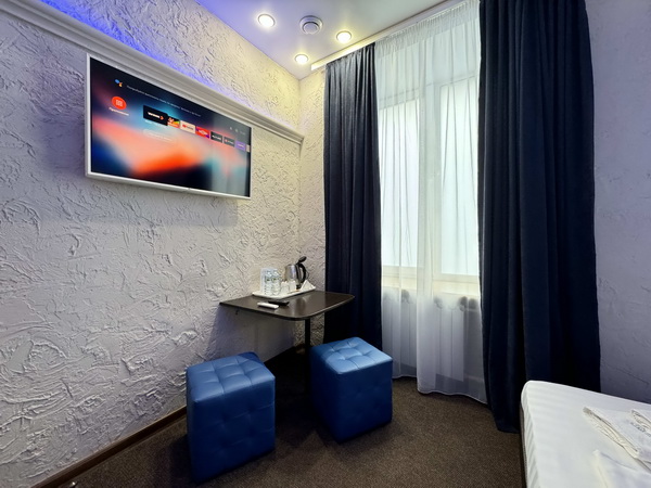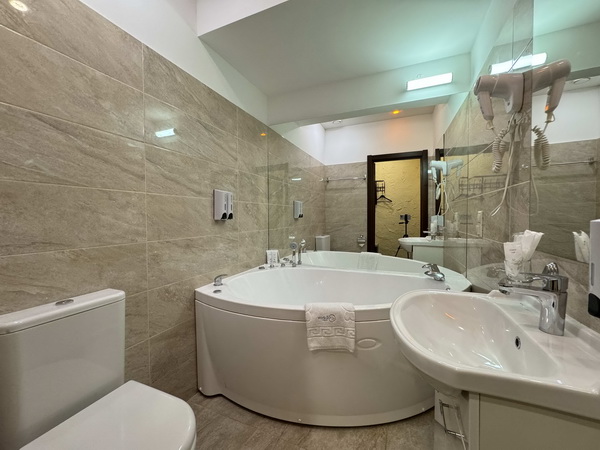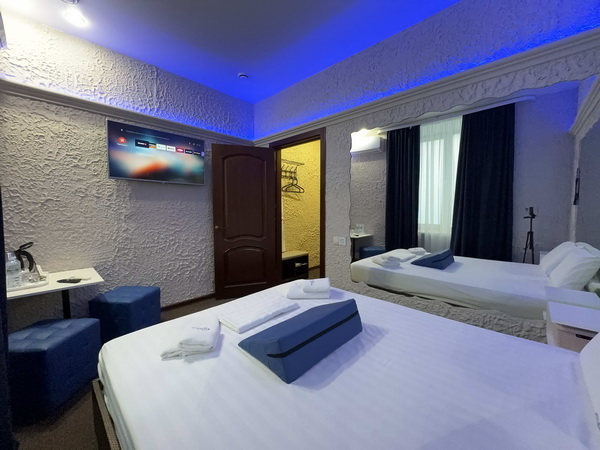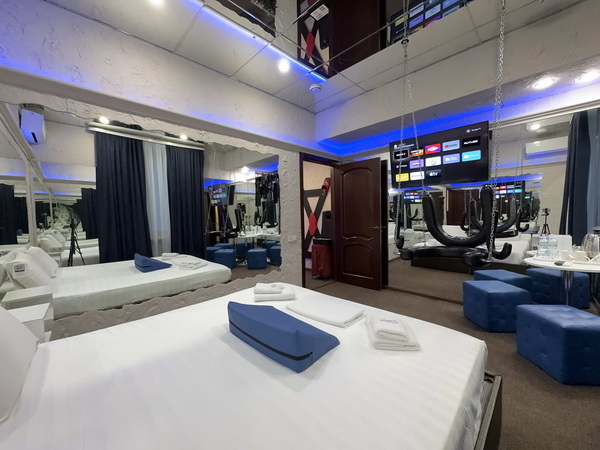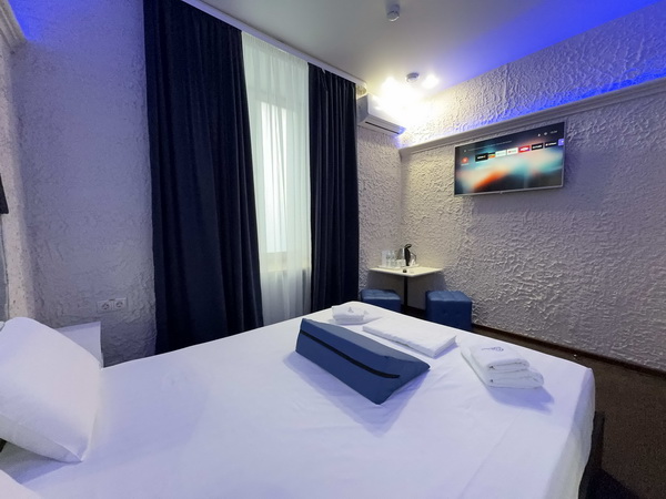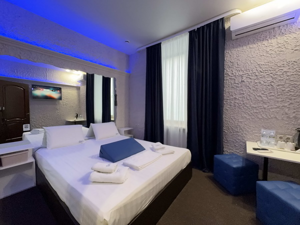 В номере есть: двуспальная кровать с тумбочками, стол со стульями, RGB подсветка, кондиционер, телевизор с Android TV, онлайн-кинотеатры с премиум подписками, колонка Алиса + Умный дом, чайная станция, бутилированная вода, полотенца, гигиенические принадлежности, халаты, тапочки, фен, джакузи для двоих в спальной зоне.