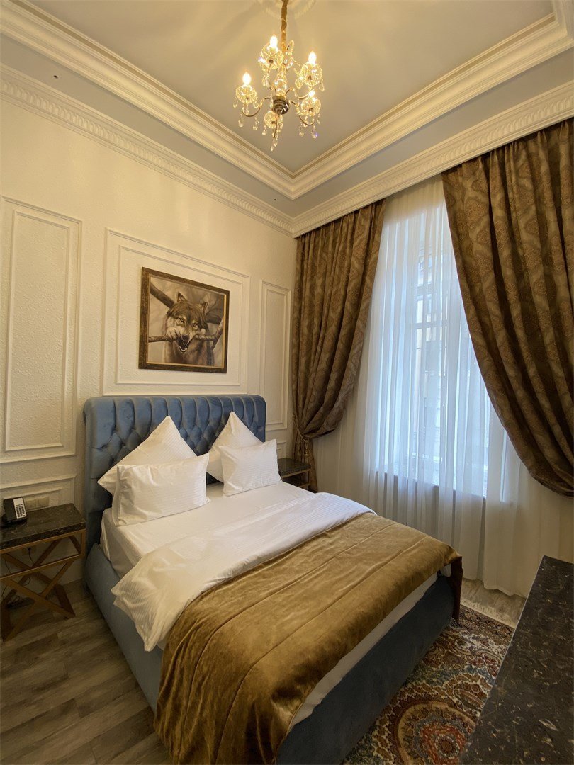 Эта гостиница на Арбате явно выделяется на фоне остальных. Она примечательна не только расположением в непосредственной близости от главных достопримечательностей Москвы, но и оригинальными интерьерами. Номера выполнены в классическом элитарном стиле с высокими потолками, плиткой под мрамор, многоуровневым освещением, премиальной итальянской мебелью и сантехникой ванной комнаты с покрытием из 24-каратного золота. В каждом номере высокоскоростной интернет, кондиционер, сейф и мини-бар. По запросу выдаются утюг и гладильная доска.