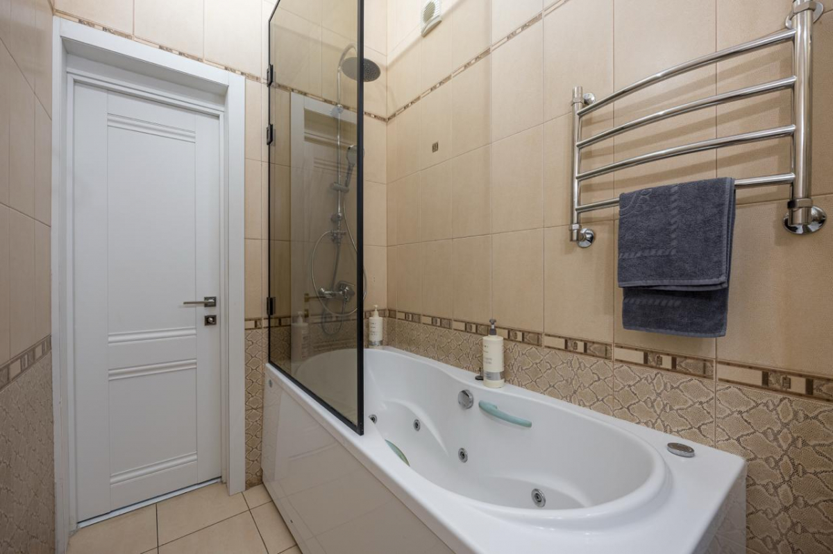 Интерьер продуман до мелочей. Широкий подоконник с подушками для созерцания Триумфальной площади, аромасвечи. Но главное сокровище — это апартаменты с джакузи. Это центр притяжения, арт-объект и место, где начинается самый важный разговор. Или не начинается — потому что слова уже не нужны. Бокальчик игристого, мерцание свечей на поверхности воды, гидромассаж, снимающий усталость целого города — ради этого момента хочется возвращаться снова и снова.