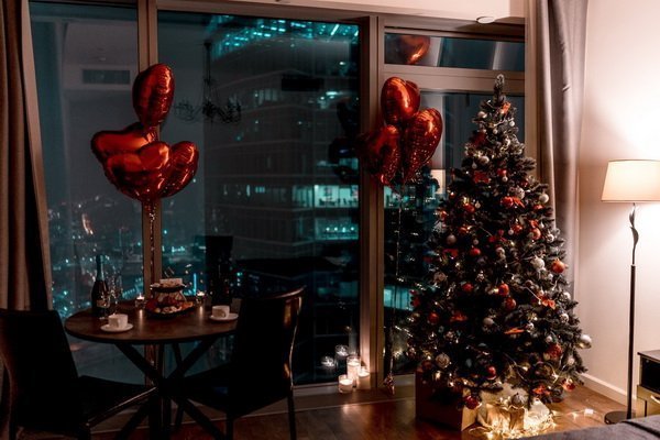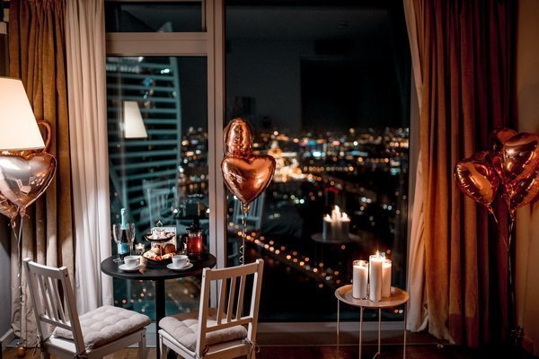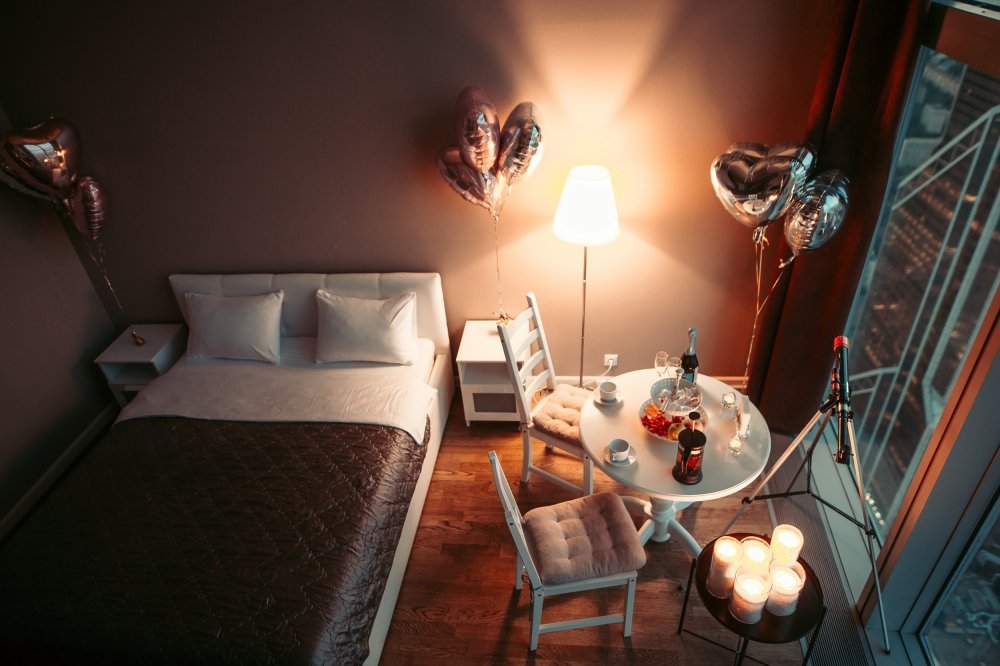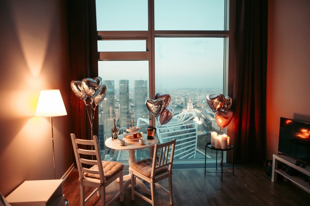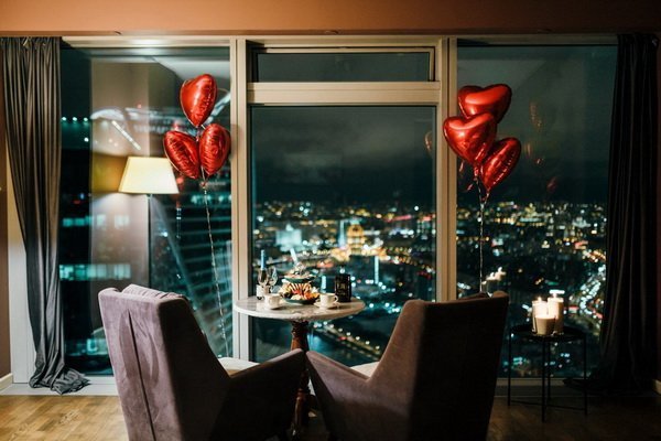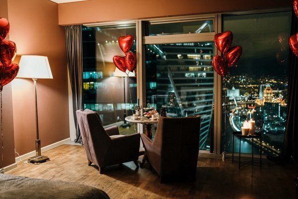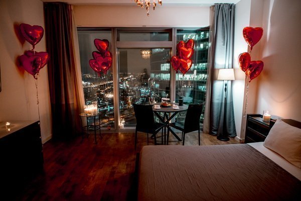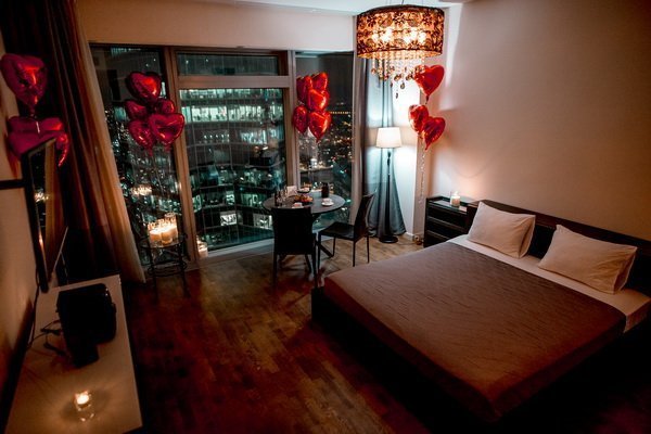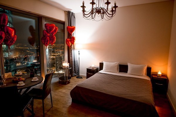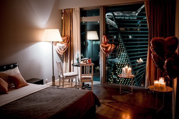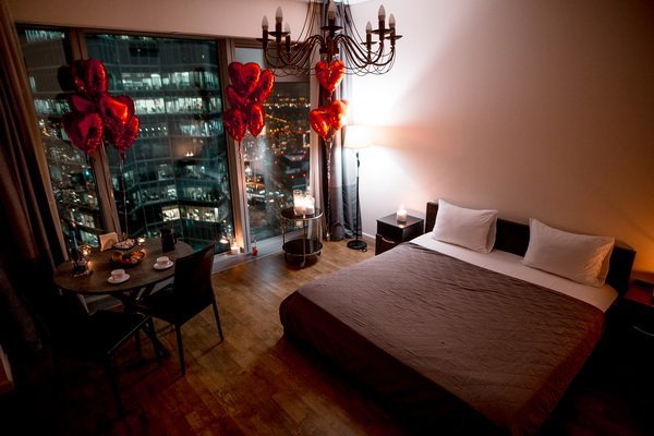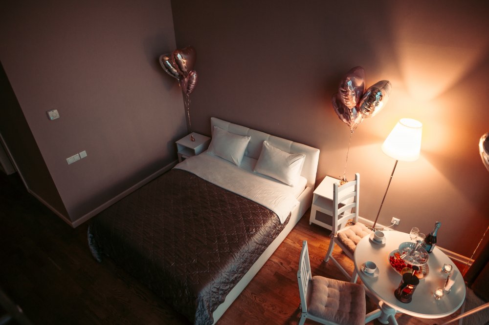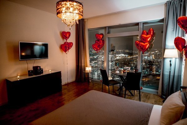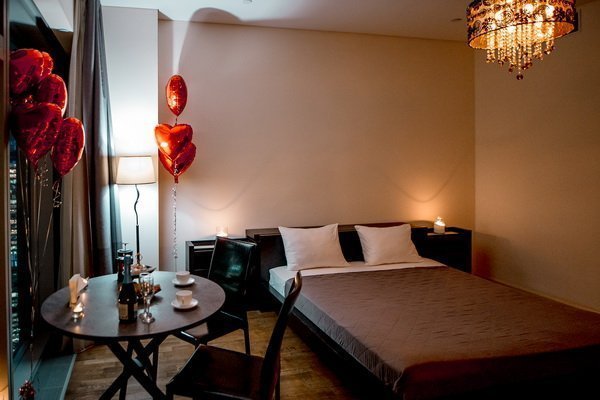 Вас ждет большое светлое пространство в приятных коричневых тонах с украшениями в виде воздушных шаров и свечей по всему периметру комнаты. В ней есть ванна, удобная двуспальная кровать, плазма, панорамные окна, потолки 5,5 метров, столик со стульями и угощения для легкого ужина (бутылка игристого, чай, фрукты и конфеты).