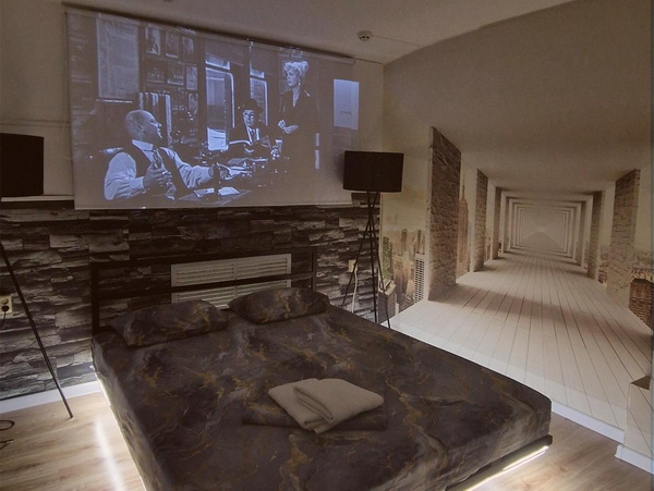 Номер Лофт предназначен для ценителей современного минимализма, теплых цветов и креативных дизайнерских решений. Декоративная кирпичная кладка и своеобразная “паутина” на стенах из натурального дерева великолепно сочетаются между собой, вызывая похвалу и позитивный настрой заселившихся гостей.