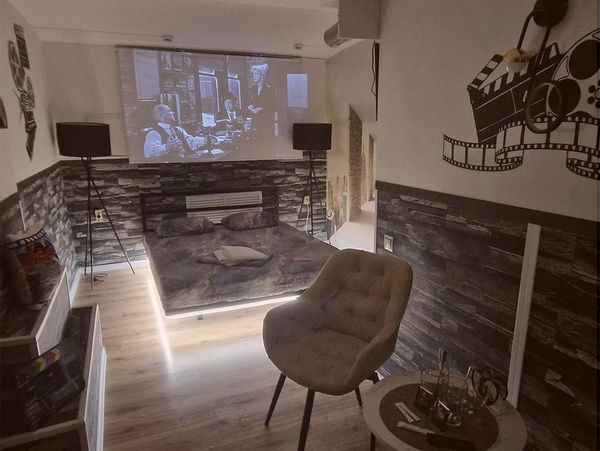 Первый вариант идеально подойдет для творческих и амбициозных личностей. Помимо большой комфортабельной кровати здесь собрано множество элементов музыкальной культуры. Есть настоящая гитара, изображение нот на стенах, проигрыватель и пластинки к нему. Общая бежево-зеленая цветовая гамма позволяет расслабиться, забыть о текущих заботах, организовать красивое свидание, проникнуться романтикой и уединением.